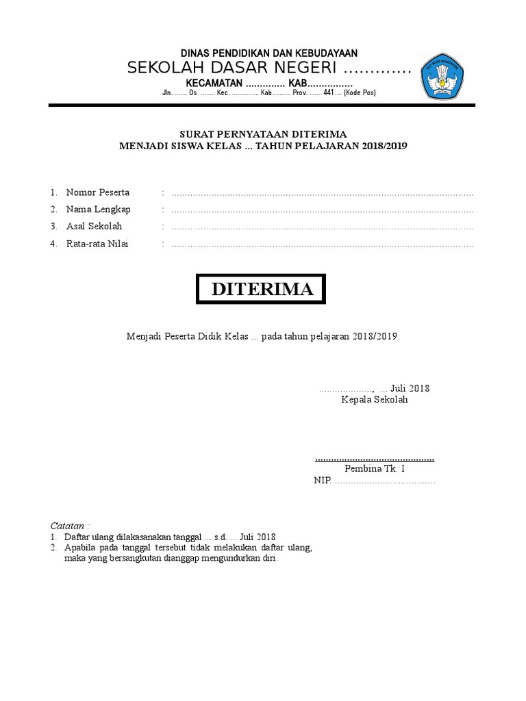 Contoh surat keterangan diterima menjadi siswa baru di sekolah sd Surat Pernyataan Diterima Menjadi Siswa Baru
