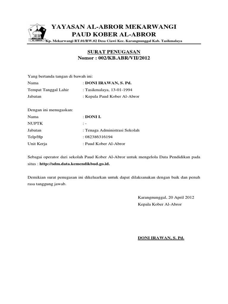 Contoh surat tugas operator yayasan 2020 Contoh Surat Operator Yayasan Guru Paud